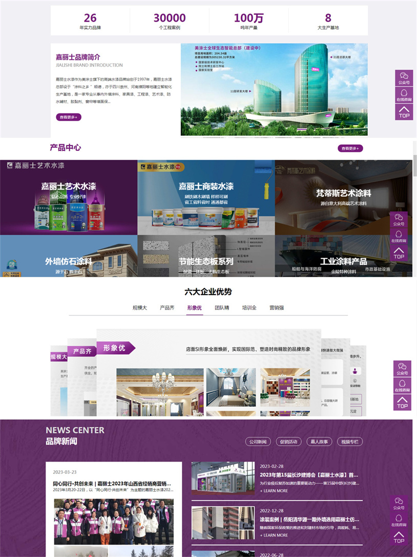 隨著市場需求的不斷升級及企業(yè)的逐步發(fā)展與壯大,為了匹配企業(yè)發(fā)展的戰(zhàn)略定位,更好地傳達(dá)企業(yè)理念與提升用戶體驗,嘉麗士水漆對官方網(wǎng)站進(jìn)行了全面的改版升級。經(jīng)過數(shù)月的謀劃籌備,全新的頁面設(shè)計,豐富的內(nèi)容展示,更舒心、更便捷的訪問體驗,有“顏值”更有“內(nèi)涵”的官方網(wǎng)站上線啦!