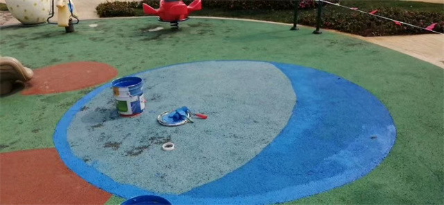 涂裝后的兒童游樂區(qū)地坪色彩鮮艷,藍(lán)、紅、綠搭配圓形圖案,充分展現(xiàn)了童趣,與周邊游樂設(shè)施一起,構(gòu)成了充滿夢幻童話的空間!
